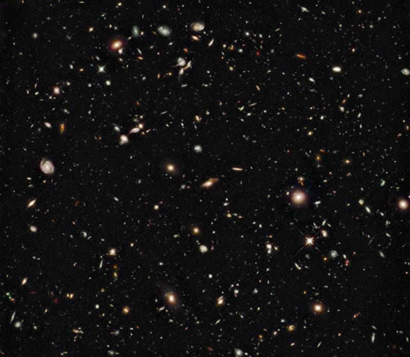 This remarkable image was collected by focusing the Hubble Space Telescope for a very long exposure on a line of site that appeared nearly empty. The light that was collected began its journey shortly after the Universe (as we know it) began, nearly 14 billion years ago.